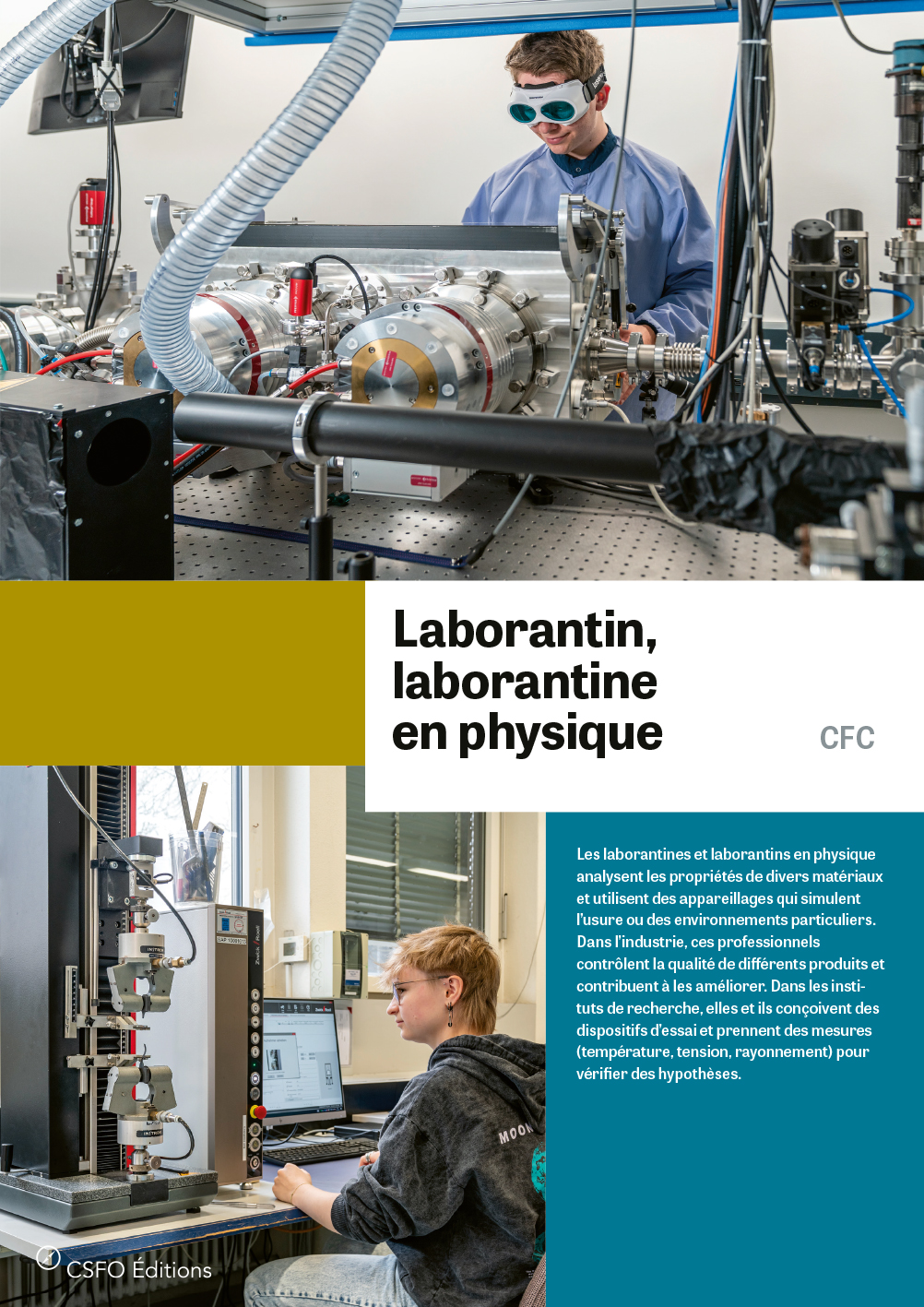 Les laborantines et laborantins en physique analysent les propriétés de divers matériaux et utilisent des appareillages qui simulent l’usure ou des environnements particuliers. Dans l’industrie, ces professionnels contrôlent la qualité de différents produits et contribuent à les améliorer. Dans les instituts de recherche, elles et ils conçoivent des dispositifs d’essai et prennent des mesures (température, tension, rayonnement) pour vérifier des hypothèses.