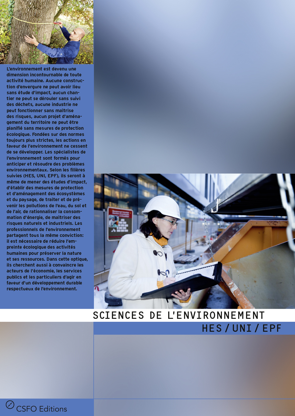 Les spécialistes de l'environnement retraitent des zones polluées et décontaminent de vieux bâtiments avec amiante. Leurs tâches peuvent comprendre des études d'impact qui permettent de modifier des projets afin qu'ils soient le moins dommageable possible pour l'environnement. Ils établissent des mesures de protection pour préserver la nature et jouent un rôle de communication très important.