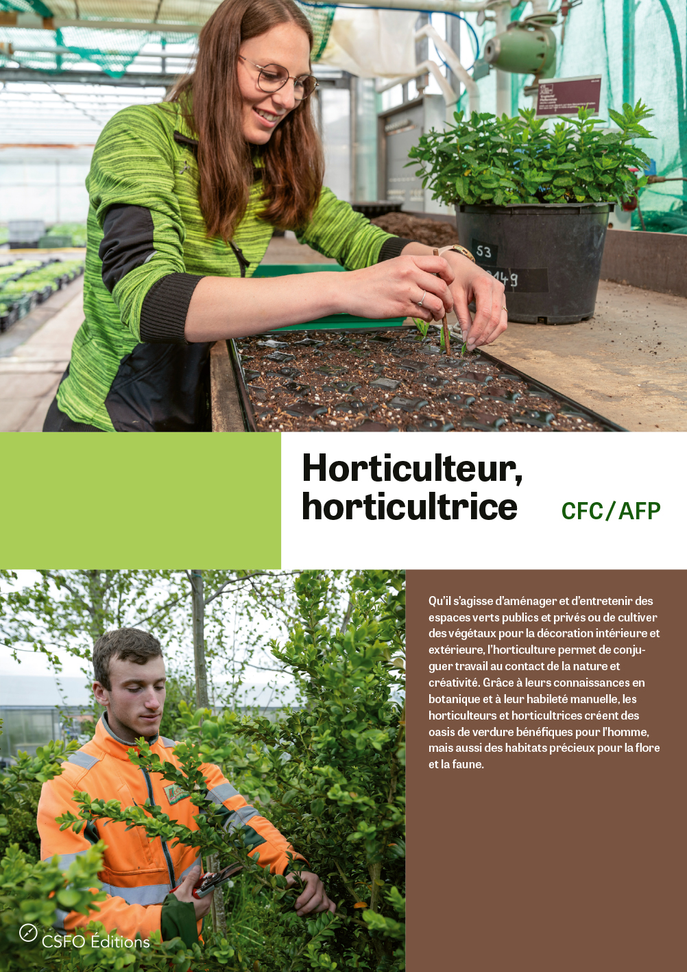 Qu’il s’agisse d’aménager et d’entretenir des espaces verts publics et privés ou de cultiver des végétaux pour la décoration intérieure et extérieure, l’horticulture permet de conjuguer travail au contact de la nature et créativité. Grâce à leurs connaissances en botanique et à leur habileté manuelle, les horticulteurs et horticultrices créent des oasis de verdure bénéfiques pour l’homme, mais aussi des habitats précieux pour la flore et la faune.